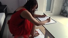 Číňanka píše rukama i nohama zároveň