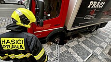 Nákladní auto se v Praze propadlo do chodníku, zásah narušil provoz tramvají